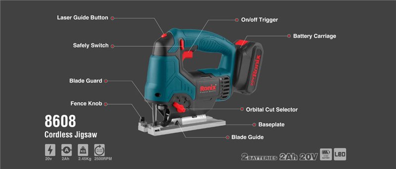 Аккумуляторный лобзик Ronix 8608, 25,4 мм, 2500 об/мин, высокая производительность (арт. 25-18031172)