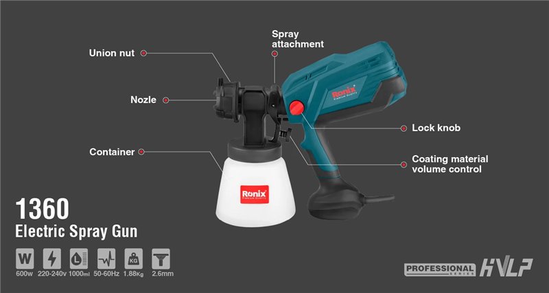 Электрический краскопульт Ronix HVLP, 1000 мл, 600 Вт, мощный сопло (арт. 25-18031264)