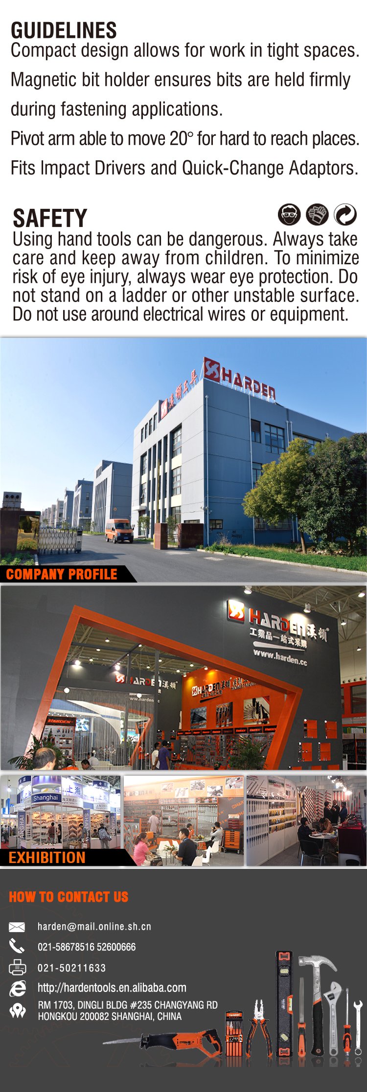 Shanghai Harden Tools Co., Ltd. - ведущая компания, специализирующаяся на производстве, разработке, продаже и сервисном обслуживании аппаратных средств и нацеленная на предоставление аппаратных средств промышленного уровня с высоким соотношением цены и качества. После многих лет развития у нас появились деловые партнеры в более чем 50 странах, с офисами исследований и разработок и продаж в Германии и т.д. В настоящее время бренд “HARDEN” стал основным выбором для клиентов в стране и за рубежом, став их надежными партнерами.