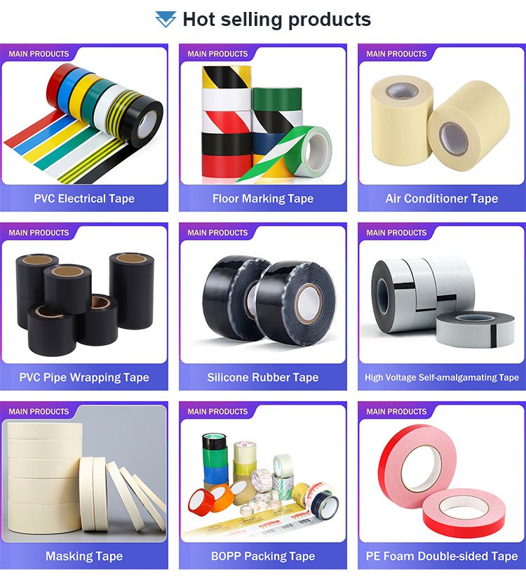 Наша основная продукция — тканевая (тканевая) изоляционная лента, ПВХ-изоляционная лента, силиконовая резиновая самоплавкая лента, ПВХ-лента для обмотки труб, упаковочная уплотнительная лента Bopp, маскирующая лента и так далее. Также принимаем заказы OEM, изготавливаем наклейки с брендом клиента, упаковываем и доставляем по мере необходимости.