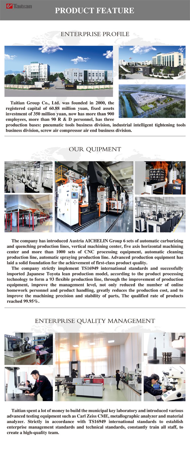 Компания Taitian Group Co., Ltd. была основана в 2007 году, уставный капитал составляет 60,88 млн юаней, в настоящее время в ней работает более 900 сотрудников. Мы являемся высокотехнологичными предприятиями, занимающимися исследованиями и разработками, продажами и производством. К чести малых предприятий-гигантов, у нас есть 3 основных производственных предприятия: отдел инструментов для затяжки, отдел воздушных компрессоров и отдел воздушных винтовых компрессоров. Наша компания всегда считала технологические исследования и разработки основной движущей силой развития предприятия. Мы создали не только ключевые муниципальные лаборатории и технологические центры предприятий, но и провинциальные центры высокотехнологичных исследований и разработок и научно-исследовательские институты. Обладая более чем 100 патентами, мы участвовали в разработке 3 национальных стандартов, 3 отраслевых стандартов, 2 групповых стандартов и 1 стандарта Чжэцзянской производственной группы. Компания Taitian всегда была убеждена, что передовое оборудование мирового класса является основой для обеспечения качества на мировом уровне. Мы располагаем передовыми производственными линиями зарубежного производства и более чем 2000 комплектами технологического оборудования с ЧПУ, а также всесторонне продвигаем MES и ERP-системы. Таким образом, компания Taitian создает уникальную новую систему управления рабочими, машинами и материалами в режиме многоканального управления и формирует режим специального, точного и интеллектуального производства, а также стала поставщиком услуг для промышленных производителей по предоставлению интеллектуальных решений для экономии энергии при затяжке и использовании винтовых воздушных компрессоров.