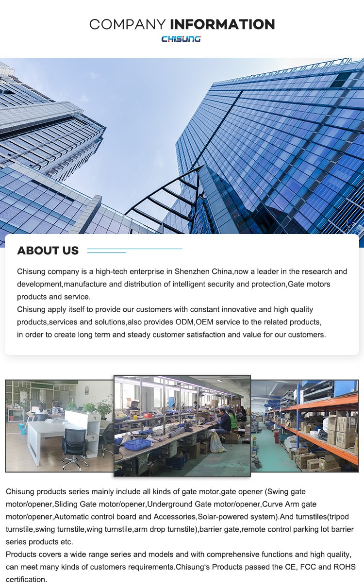 Компания Chisung уже 17 лет использует бесщеточный двигатель постоянного тока для всех турникетов и шлагбаумов, а наша технология двигателей для ворот основана в 1991 году. На сегодняшний день у нас есть по меньшей мере 30-летний опыт производства и более 30 комплектов различных двигателей для ворот. У нас есть собственные пресс-формы, производственное оборудование и печатные платы.
