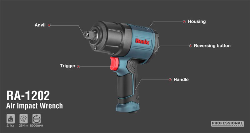 Пневмогайковерт Ronix RA-1202, 1/2 дюйма, 1150N·m, для автосервиса и профессионалов (арт. 25-18031136)