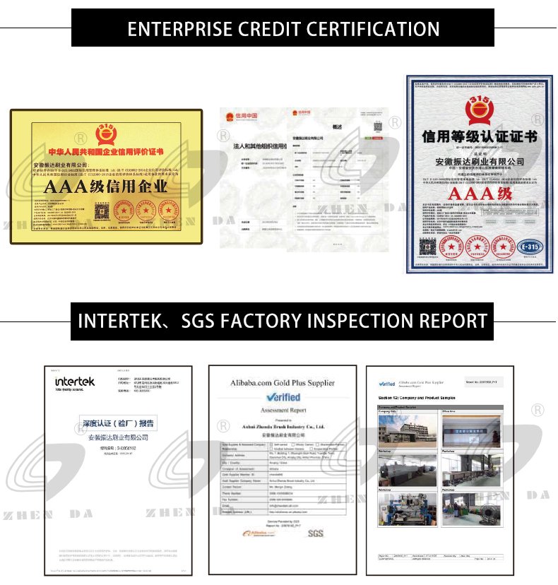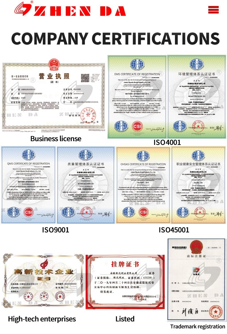 Продукция экспортируется по всему миру, в основном это промышленные щеточные валики, щетки для подметания дорог, щетки для уборки снега, щетки для мытья полов, полосовые щетки, щетки для крупного рогатого скота, щетки для полировки, щетки для автомойки и так далее. Компания Anhui Zhenda Brush Industry Co., Ltd. располагает научно-исследовательской группой с глубокой теоретической базой, высокой технической грамотностью и мощным потенциалом в области научных разработок. Основное внимание компании уделяется исследованиям физических и химических свойств материалов, а также инновациям и оптимизации процесса их получения.