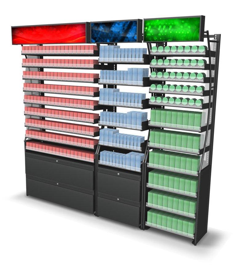 Широкий ассортимент стеллажей, витрин, дисплеев и торговой мебели — металлические, деревянные и комбинированные конструкции, односторонние и двусторонние, с подсветкой и без.