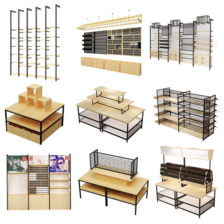 Широкий ассортимент стеллажей, витрин, дисплеев и торговой мебели — металлические, деревянные и комбинированные конструкции, односторонние и двусторонние, с подсветкой и без.